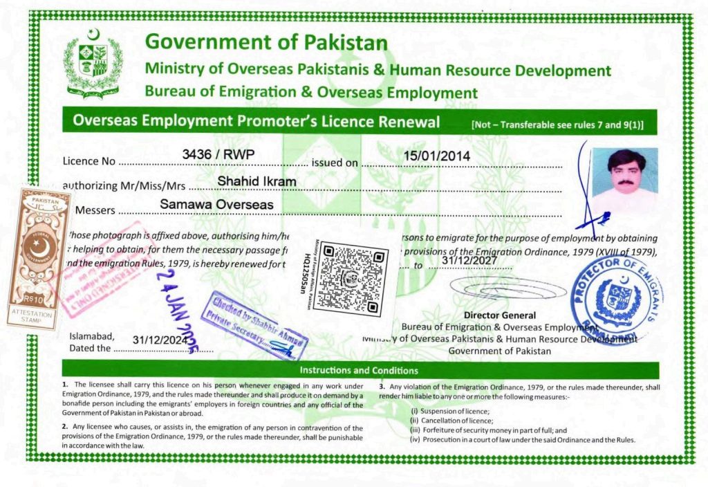 M/s SAMAWA Overseas Employment Promoters is a government licensed recruitment agency, registered under License No. OPS & HRD/3436/RWP by the Government of Pakistan. Conveniently located in the heart of Rawalpindi and Islamabad, our office is easily accessible from all major areas. We are fully equipped with state-of-the art communication infrastructure, highly experienced and dedicated team, strong manpower network, , and a comprehensive computerized database. Our advanced digital systems allow us to efficiently match the right candidates to the right opportunities often with just a single click—ensuring timely and accurate recruitment solutions.